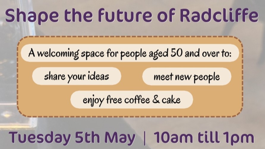 Are you over 50? Help shape the future of Radcliffe - share your ideas in a safe space and enjoy some free coffee and cake.